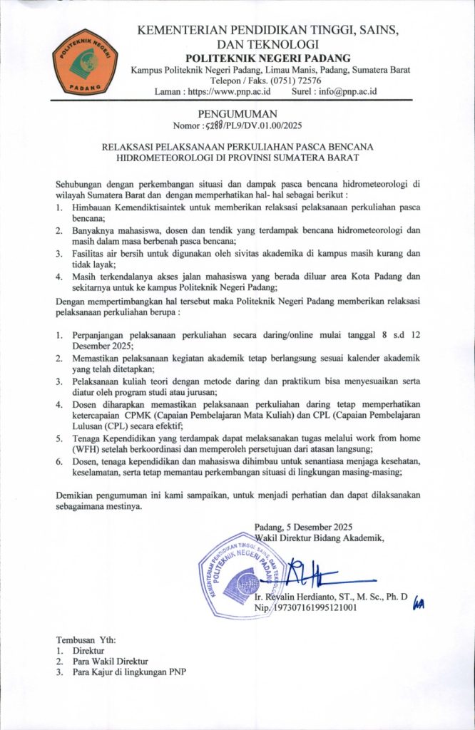 Pengumuman Relaksasi Pelaksanaan Perkuliahan Pasca Bencana Hidrometeorologi